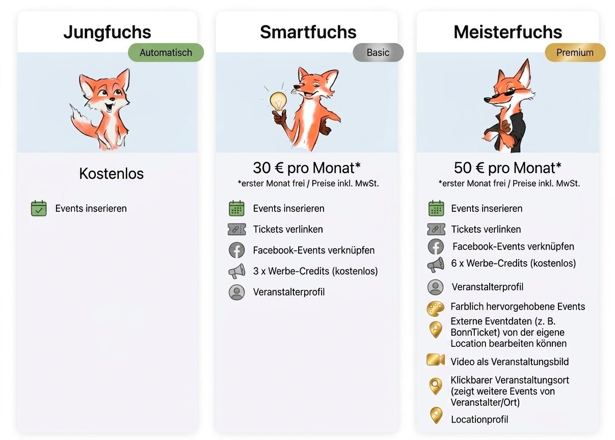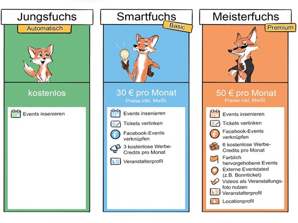 Mit dem Erstellen deines kostenlosen Veranstalter-Kontos bist du automatisch Jungfuchs und kannst Events erstellen. Mit unseren Abos Fuchs und Meisterfuchs schaltest du als Veranstalter exklusive Zusatzfunktionen frei.