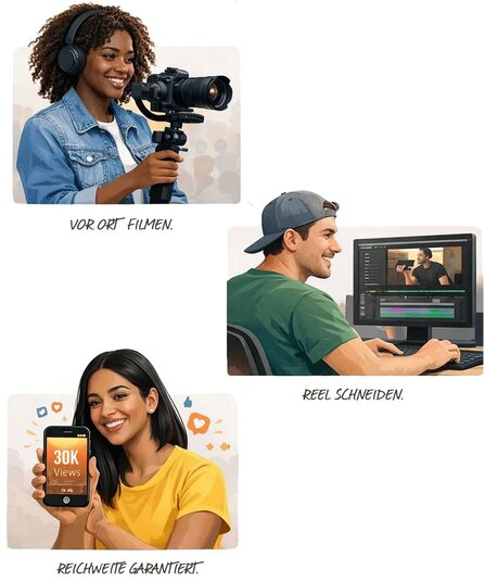 Im Anschluss veröffentlichen wir dein Kurzvideo über unsere reichweitenstarken Kanäle – mit einer garantierten Sichtbarkeit von mindestens 30.000 Views.